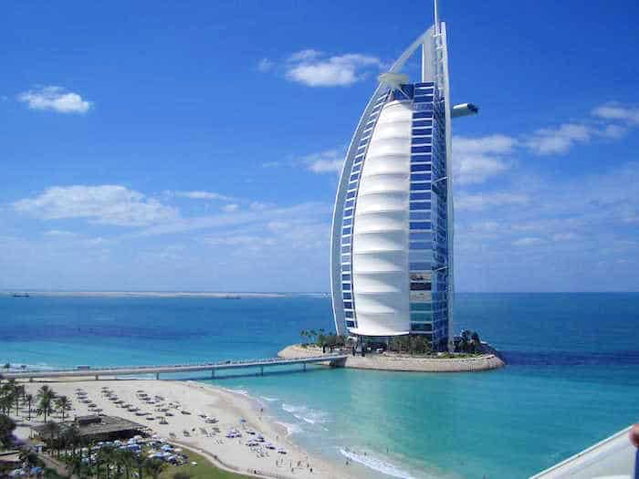Quest'ultimo, meglio conosciuto come "La Vela" è un altro dei simboli più significativi di Dubai. Famoso per la sua forma a vela per l'appunto, ospita il primo albergo 7 stelle nel mondo, si trova su un isola tutta sua a circa 300 metri dalla terra ferma con la quale è collegato attraverso un ponte accessibile solamente agli ospiti dell'hotel. Non è visitabile per i turisti se non da lontano oppure prenotando in uno dei ristoranti situati al 27° piano da dove si puo' godere di un bellissimo skyline sull'oceano indiano e sulla città, però tenete conto che un pranzo si aggira intorno ai 200 € a persona!!!
